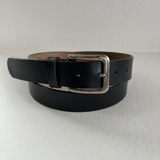 Sort, enkelt og helt klassisk læderbælte med firkantet sølvspænde.
