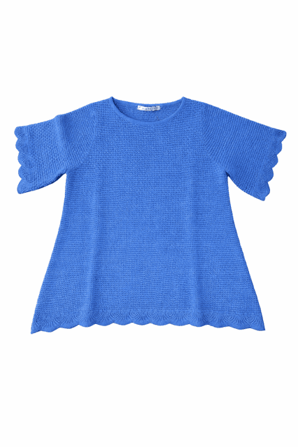Blusen er strikket i bomuldsflamé ( som giver garnet en ujævn struktur) og et enkelt hulmønster, hvilket giver blusen et let og levende udtryk.