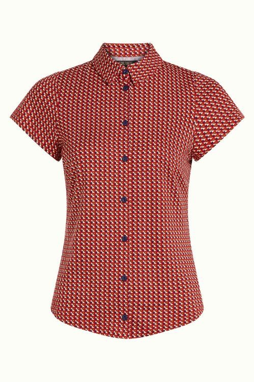 Skjortebluse med korte ærmer i et klassisk grafisk print i rød, hvid, blå og olivengrøn.