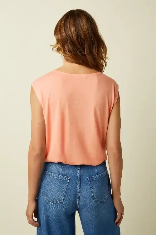 Koralfarvet top uden ærmer, der dog dækker  lige lidt af overarmen.