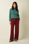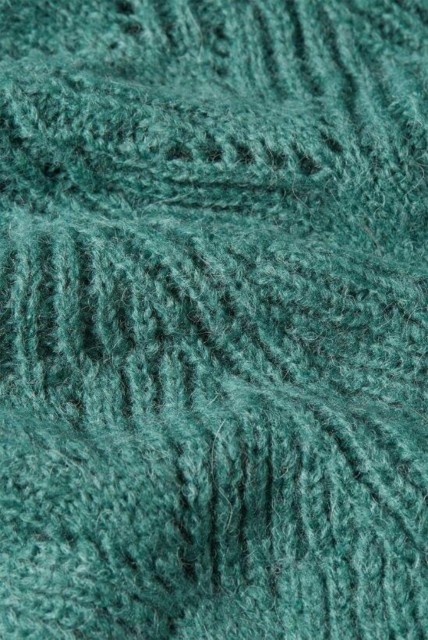 Strikbluse i smaragdgrøn med chevron/v-formet hulmønster.