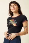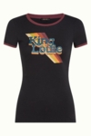 Selve T-shirten er sort med rødbrune kanter i hals og ærmekanten.