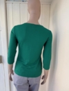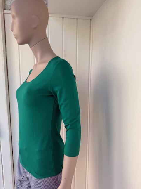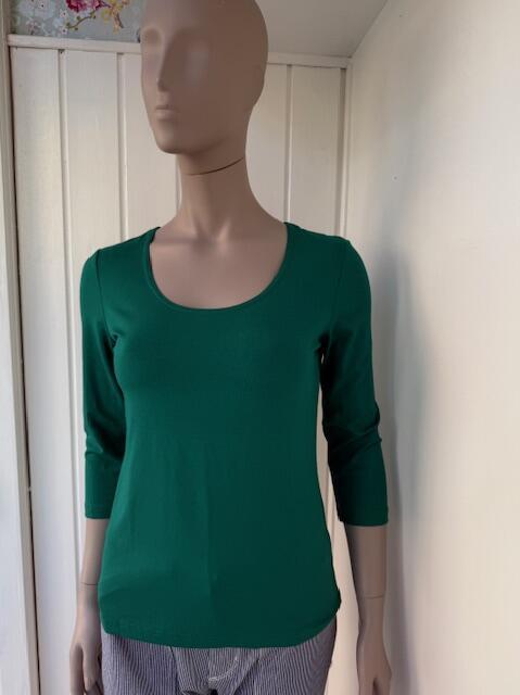 Jadegrøn T-shirt med rund hals og 3/4 ærmer. Denne bluse sidder ind til kroppen. Du kan vælge den en  størrelse større så den sidder lidt mere løst ind mod kroppen.