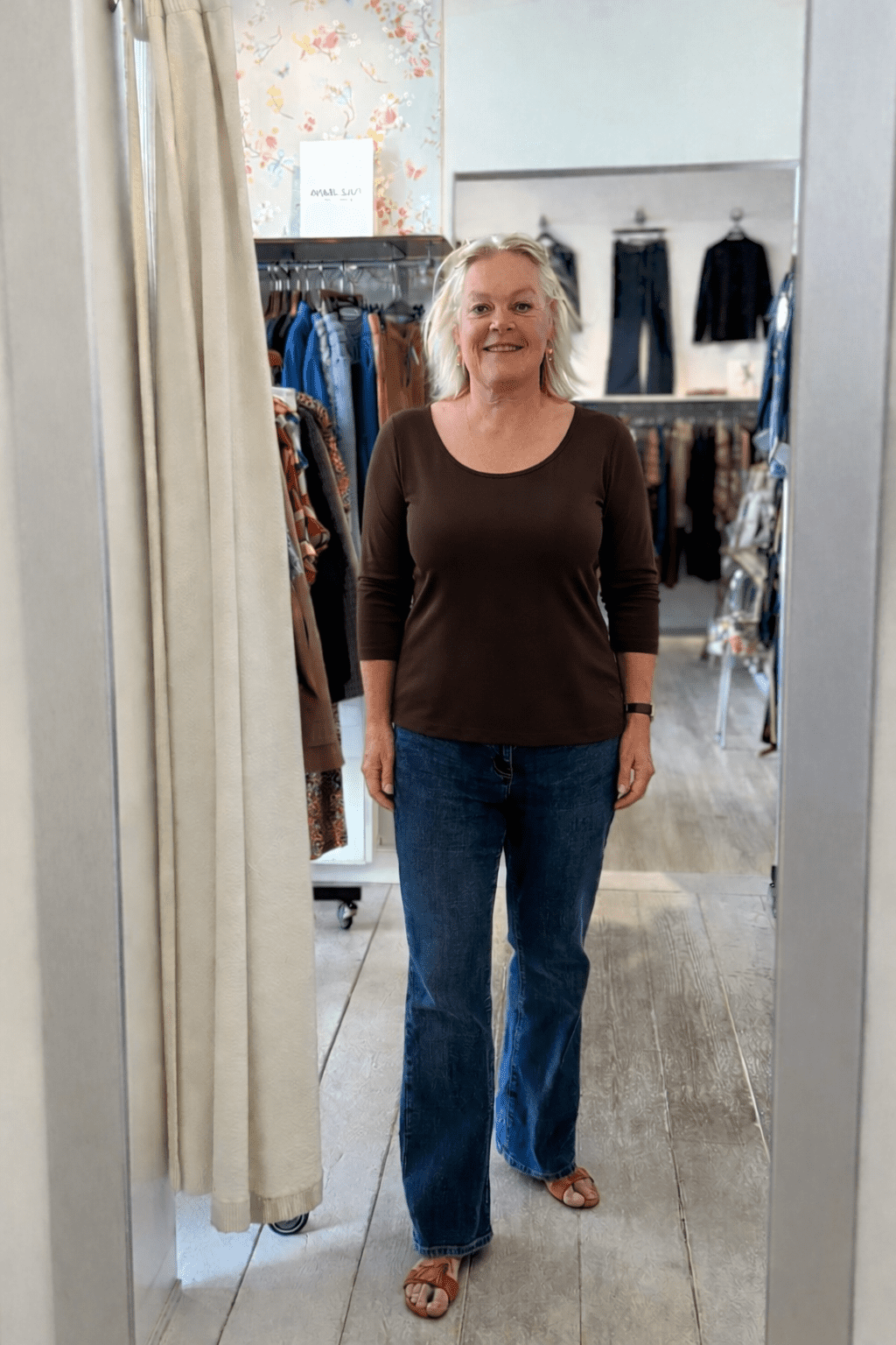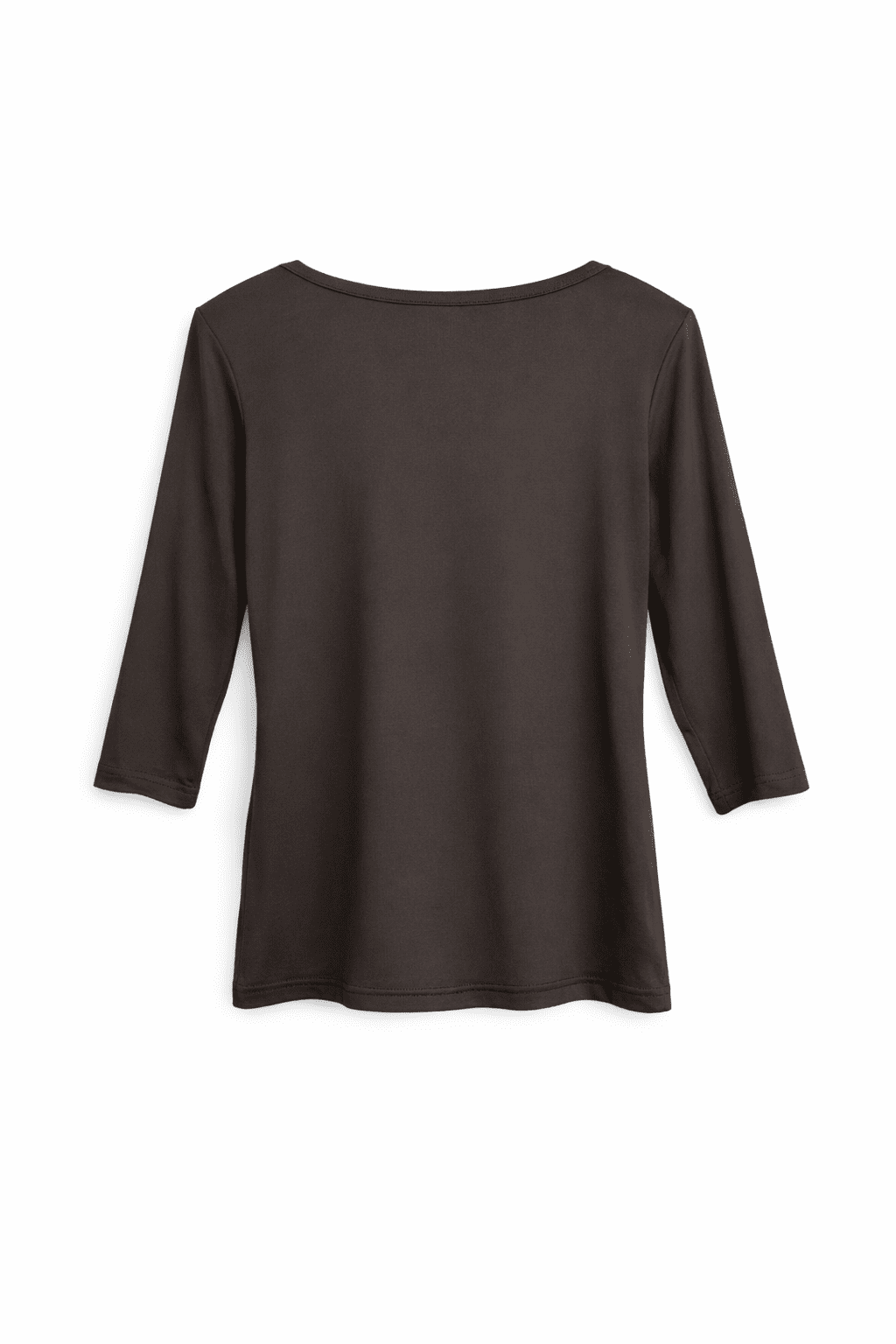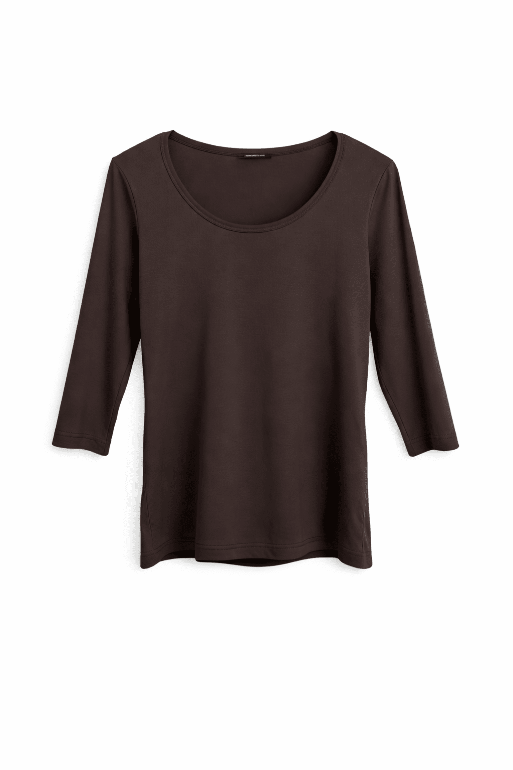 Mørkebrun T-shirt med rund hals og 3/4 ærmer. Denne bluse sidder ind til kroppen. Du kan vælge den en størrelse større så den sidder lidt mere løst ind mod kroppen.