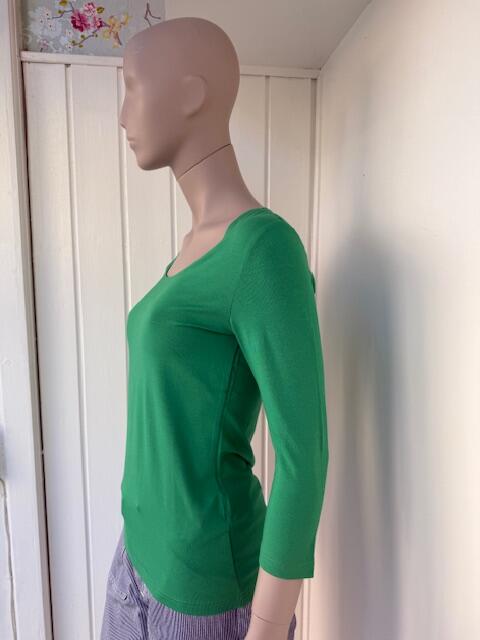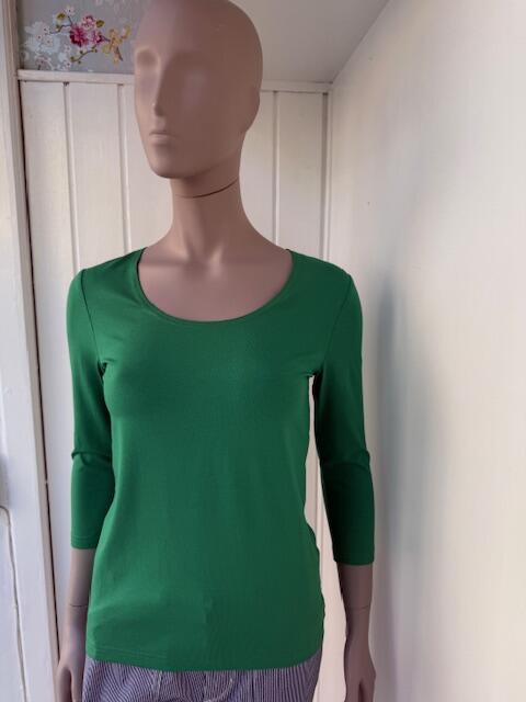 T-shirt med rund hals og 3/4 ærmer. Denne bluse sidder ind til kroppen. Du kan sagtens vælge en størrelse større, hvis du vil have den skal sidde løsere.