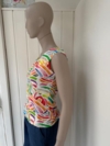 Blusen har et print i stærkeklare farver; Grøn, gule, pink, violet og orange nuancer. Bundfarven på blusen er hvid.