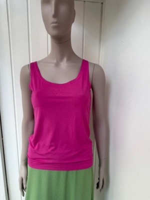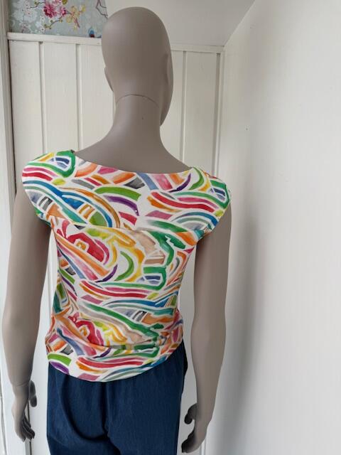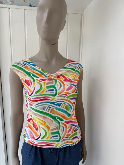 Bluse uden ærmer og v-formet hals,der er samlet med en lille strop, så der kommer lidt rynker.