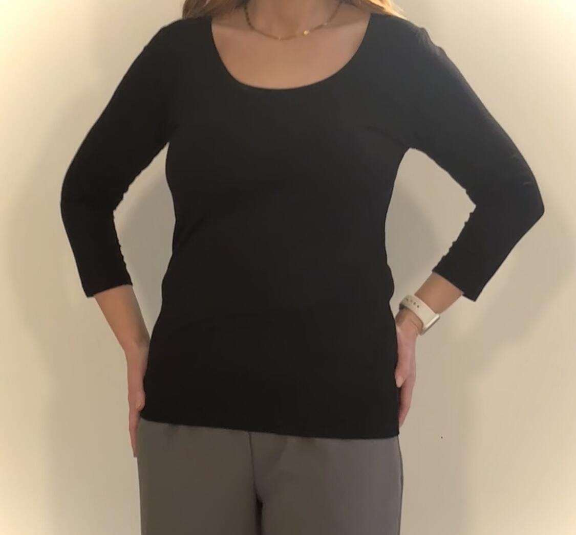 Sort  T-shirt med rund hals og 3/4 ærmer. Denne bluse sidder ind til kroppen. Du kan vælge den en  størrelse større så den sidder lidt mere løst ind mod kroppen.
