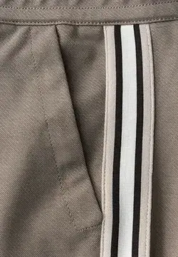 Bukserne har vidde lår og benvidde. På ydersiden er der en gallon med striber i hvid, grå og sort.