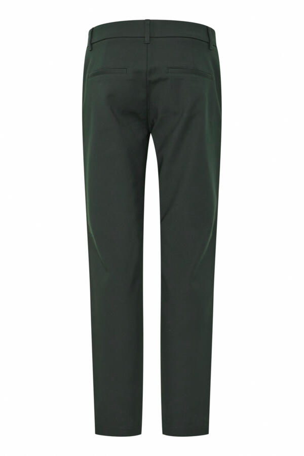 Mørkegrønne ankellange bukser med almindelig høj talje med bæltestropper i linningen.