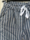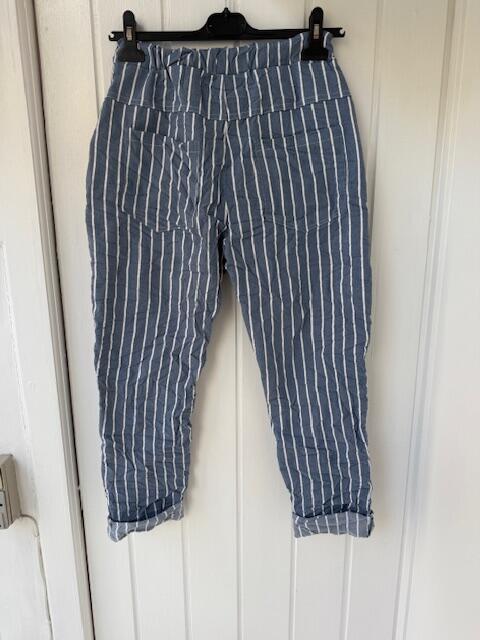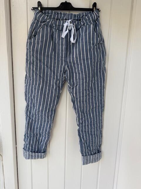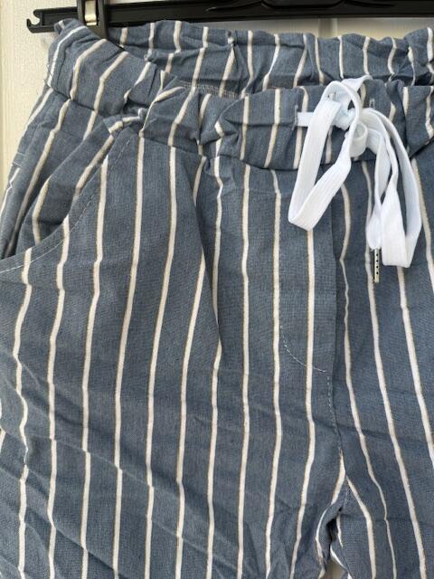 Relaxbukser i støvet mellemblå med en tynd hvid og en tynd guldglimmer striber Marta du chateau.
