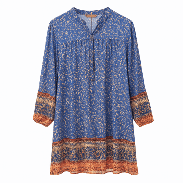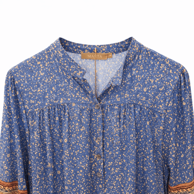 Kjolen er i et fint småmønstret print i blå bundfarve og småmønstret i gyldne farver.
