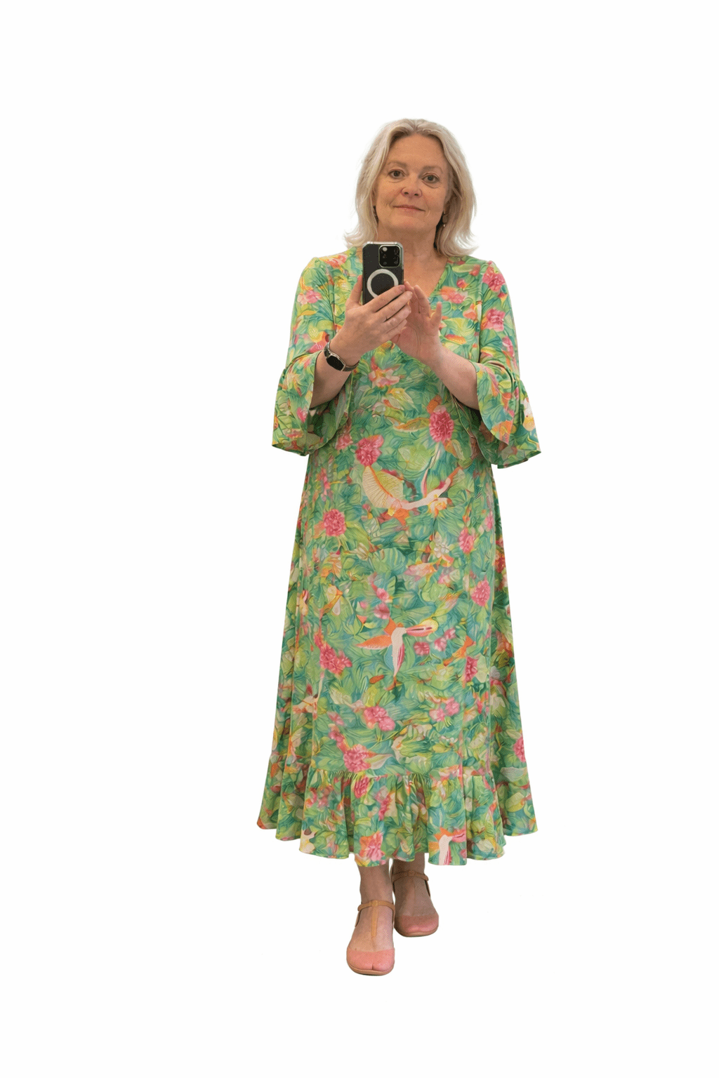 Kjolen har en v-formet halsåbning og 3/4 ærmer, med trompetærmer.
