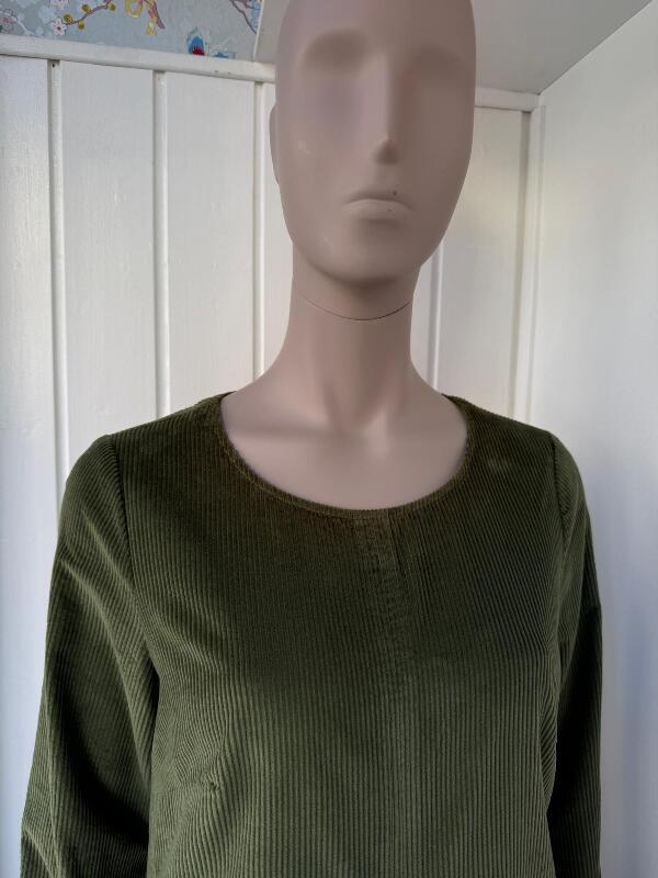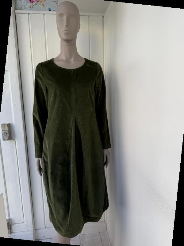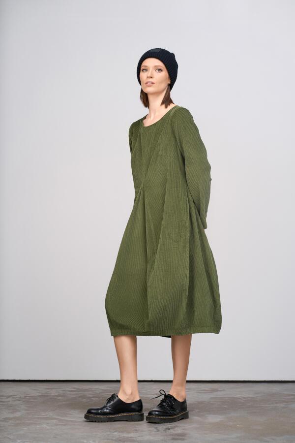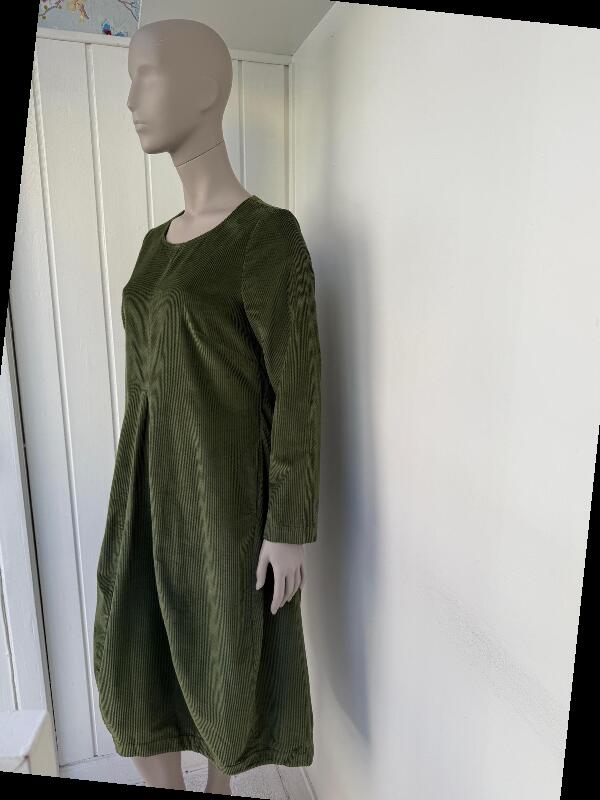 Olivengrøn kjole i bredriflet bomuldsfløjl.