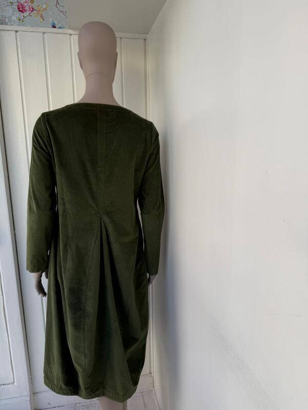 Olivengrøn fløjlskjole i blødt bredriflet 100% bomuldsfløjl.