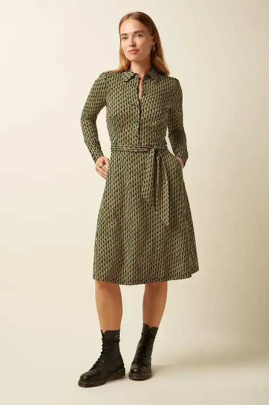 Kjole med krave og v-formet halsåbning, Kjolen har knapper ned til taljen, der er et stofbælte i samme stof som resten af kjolen.