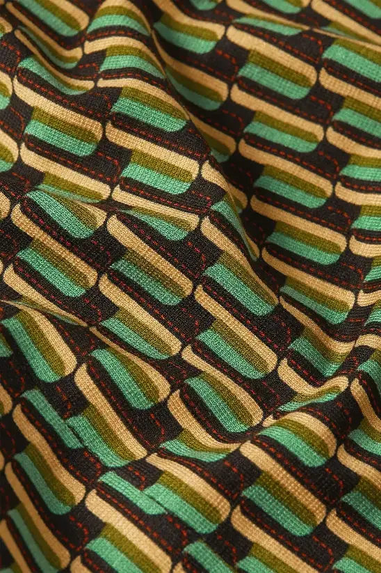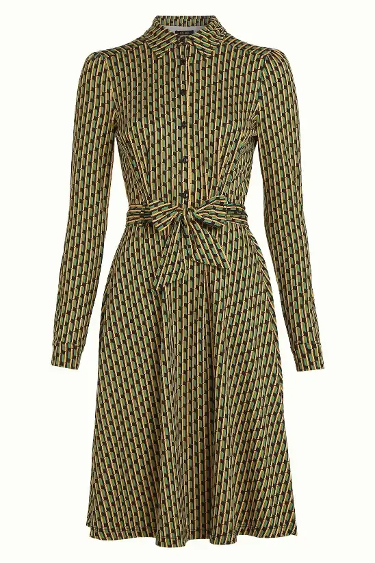 Mønstret i kjolen er klassisk i farverne grønne, sort og beige.