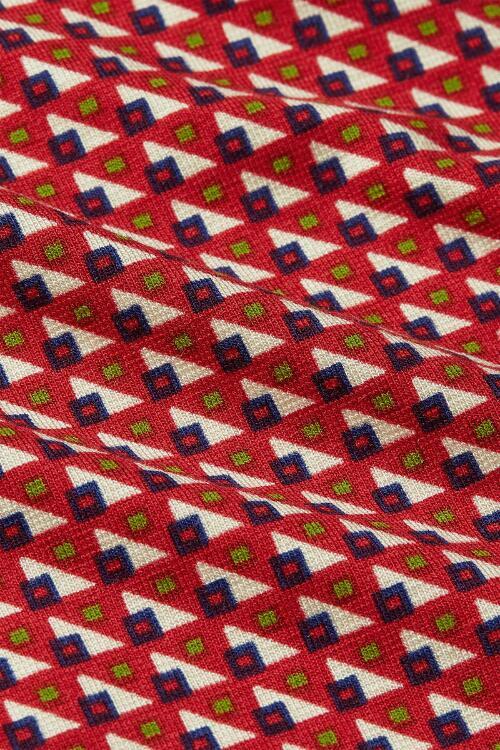 Printet er klassisk, geometrisk og småmønstret i farverne rød, lysegrøn, råhvid og indigo.