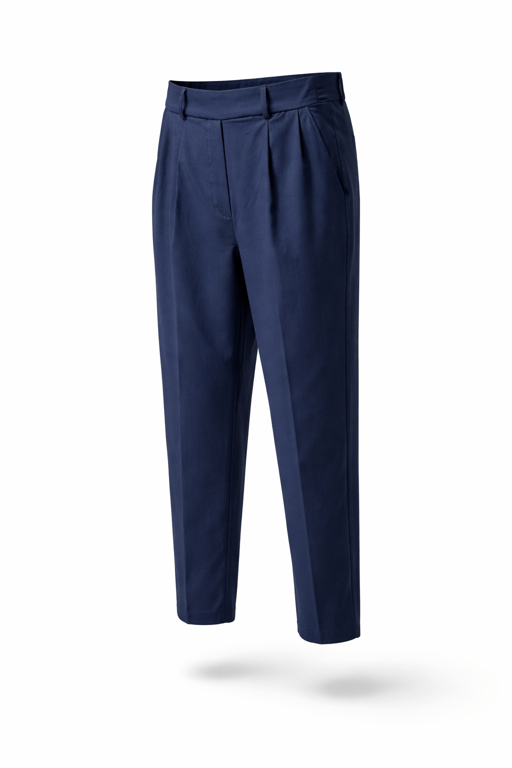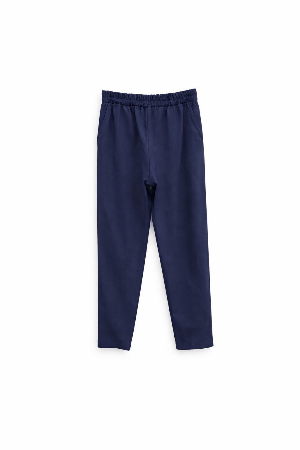 Mørkeblå bukser med almindelig taljehøje og elastisk linning, der er glat foran, så den sidder pænt.