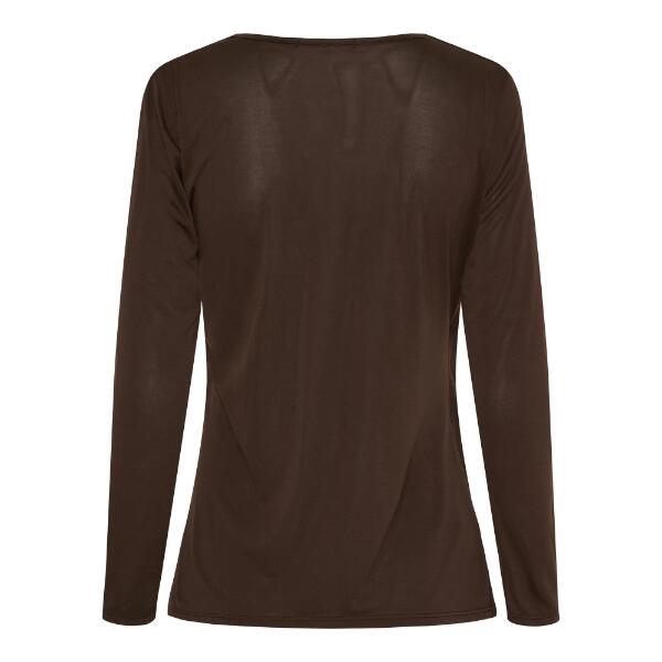 Brun bluse med v-formet halsåbning og lange ærmer.