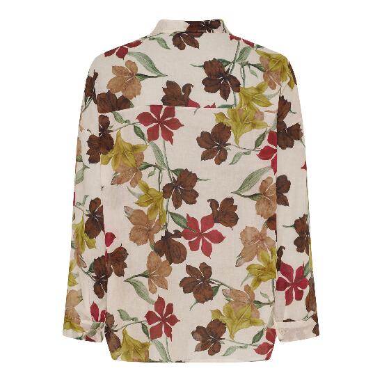 Skjorten har et smukt print af blade i efterårsfarver; brune, lime,bordeaux og grønne stilke.