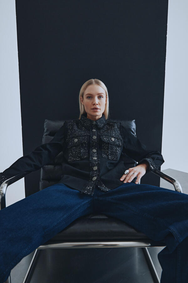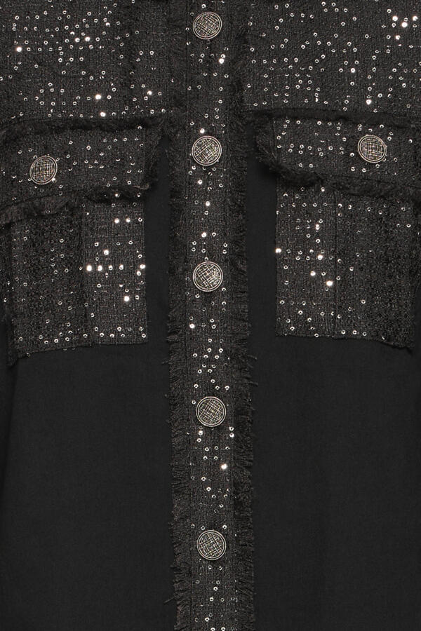 Skjorten har et sort vævet stof med små palietter for krave, bryst, skuldre og manchetten.
