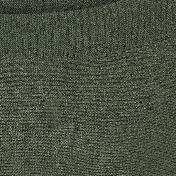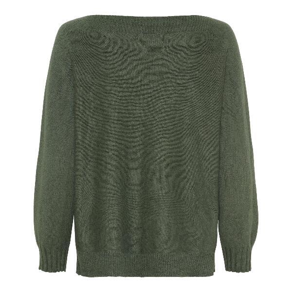 Bluse i støvet olivengrøn farvet strik med bådformet halskant i ribstrik og lange ærmer der er afsluttet med en ribkant.